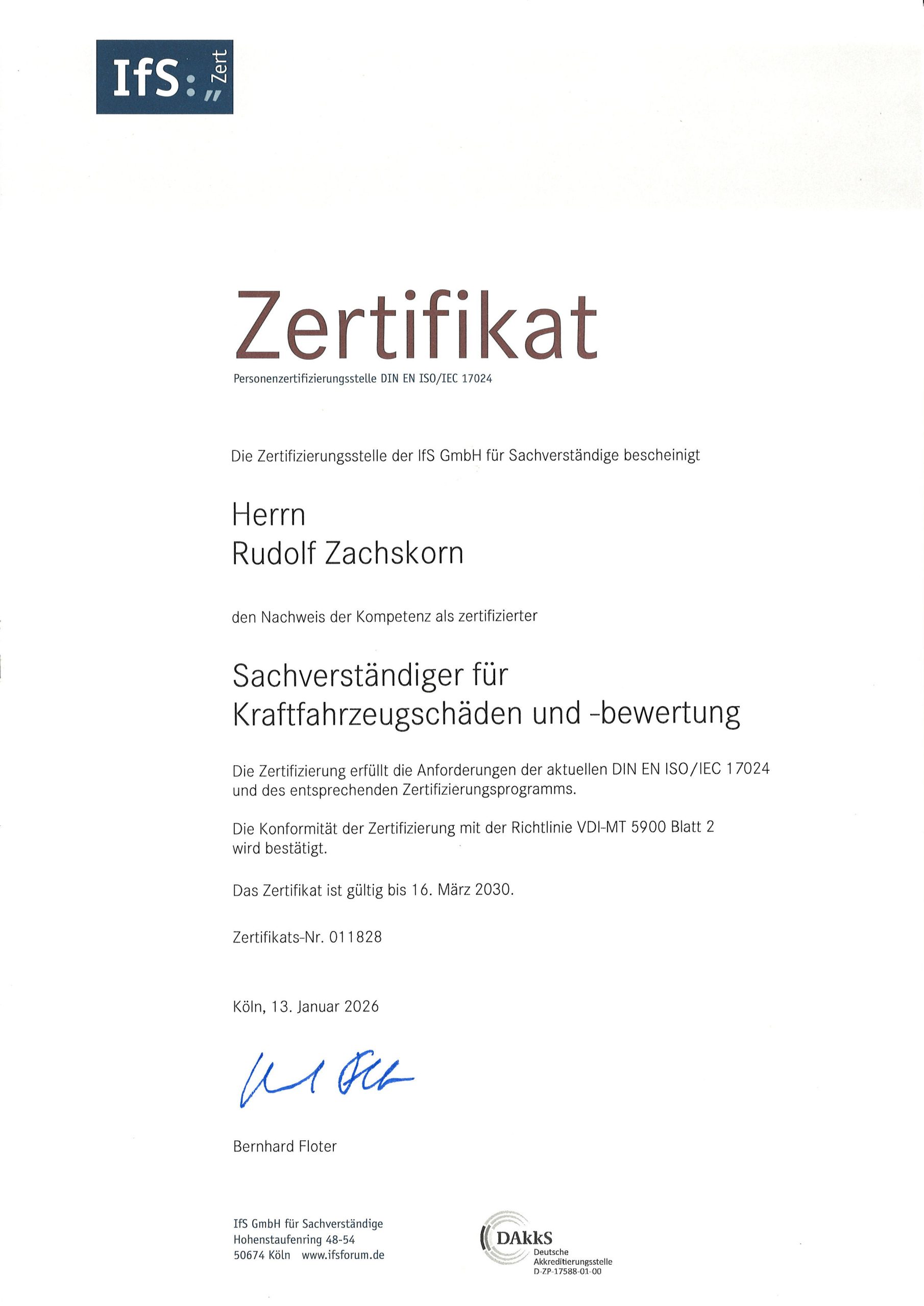 zertifizierter Sachverständiger (IfS-Zert) für Kfz-Schäden und -Bewertung, IfS GmbH
